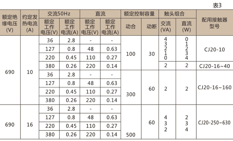 接觸器輔助觸頭參數(shù)見(jiàn)表3