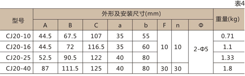 CJ20-10~40外形尺寸及安裝尺寸見(jiàn)圖1、表4(CJ20-10~25可以用“T”軌道安裝)。