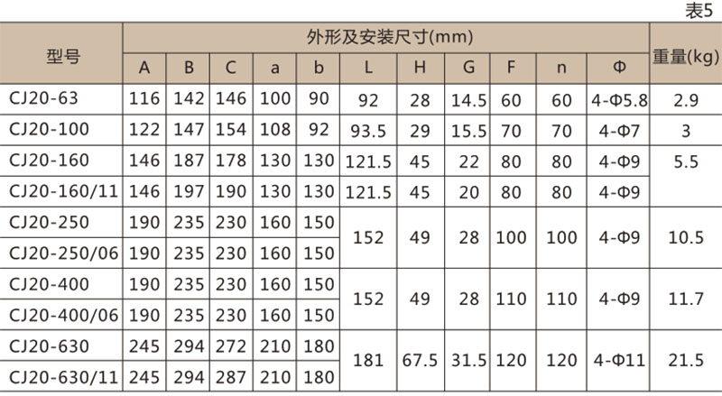 CJ20-63~630外形尺寸及安裝尺寸見(jiàn)圖2、表5
