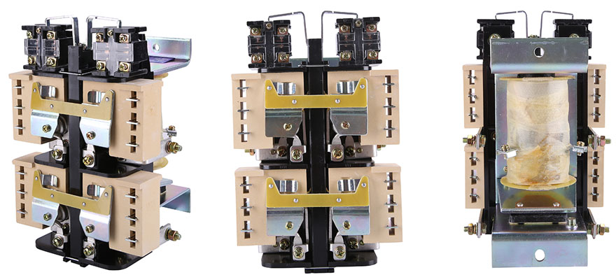 150A及以下的接觸器為立體布置結(jié)構(gòu),接觸器的磁系統(tǒng)為拍合式。由繞棱角轉(zhuǎn)動的銜鐵和帶骨架的線圈組成。主觸頭系統(tǒng)為直動式、雙斷點串聯(lián)磁吹滅弧裝置。