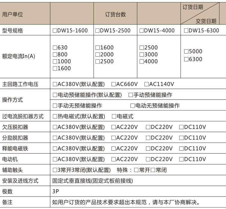 規(guī)型號有:DW15-630,DW15-1600,DW15-2500,DW15-4000
