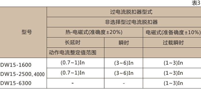 過電流脫扣器動作電流整定值調(diào)節(jié)范圍見表3