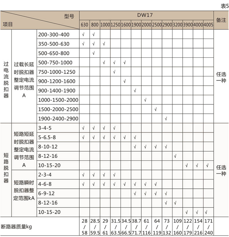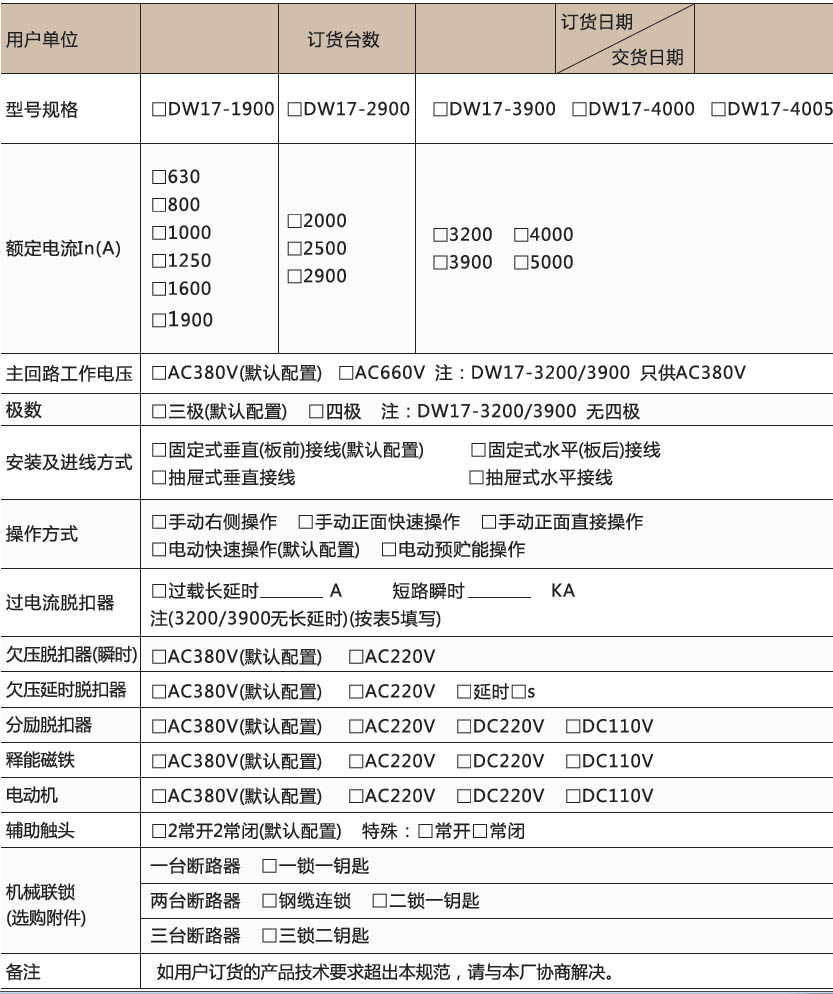 注:DW17-630/800/1000/1250型斷路器選用過(guò)電流脫扣器額定電流可分別提高到760/910/1200/1300A。