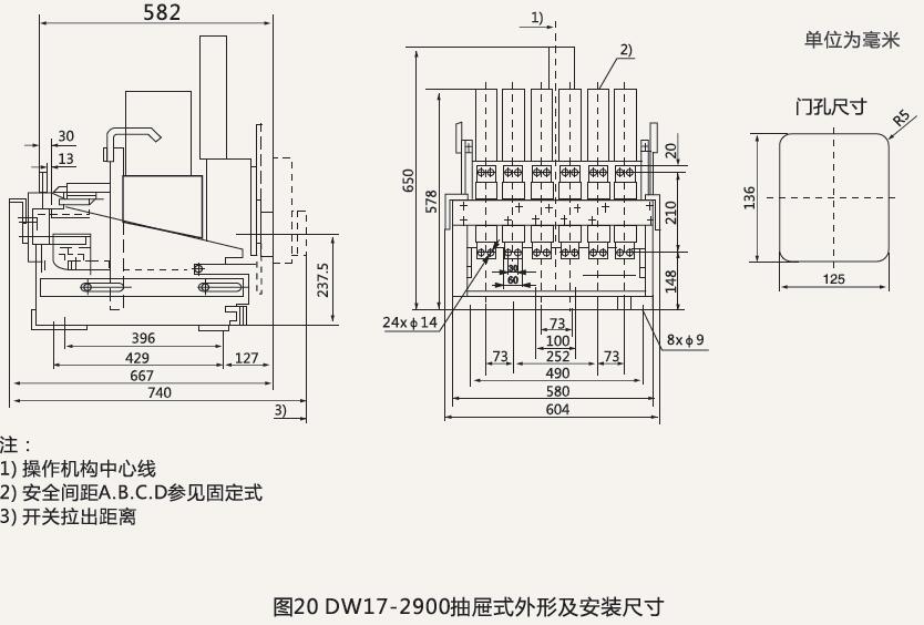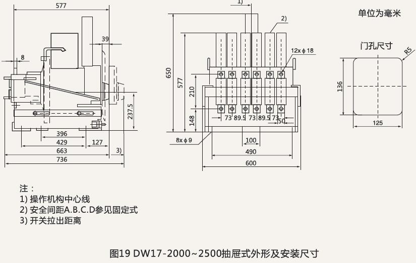 ○DW17-2000~2500抽屜式斷路器的外形尺寸及安裝尺寸見(jiàn)圖18