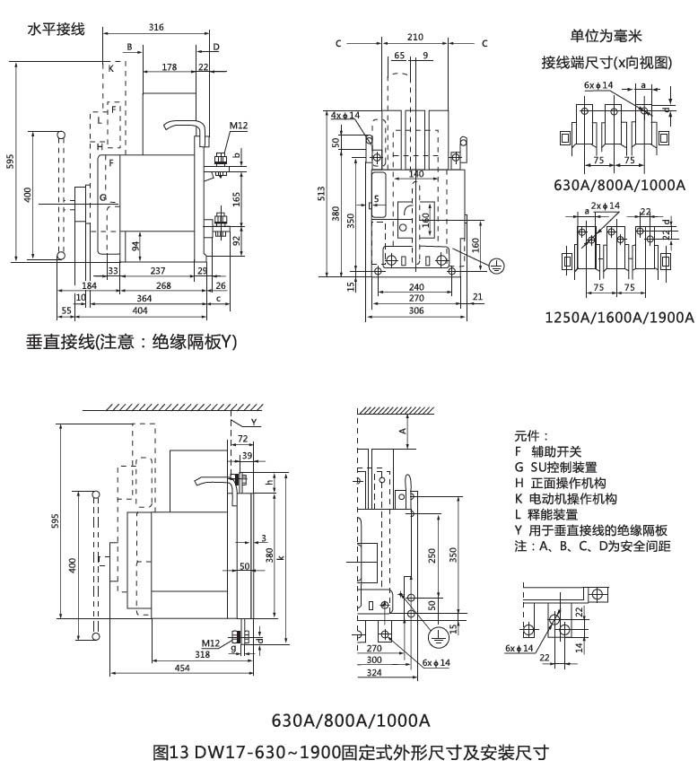 ○ DW17-630-1900固定式斷路器的外形尺寸及安裝尺寸見(jiàn)圖13和表9