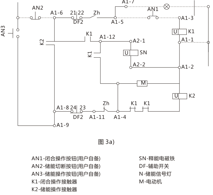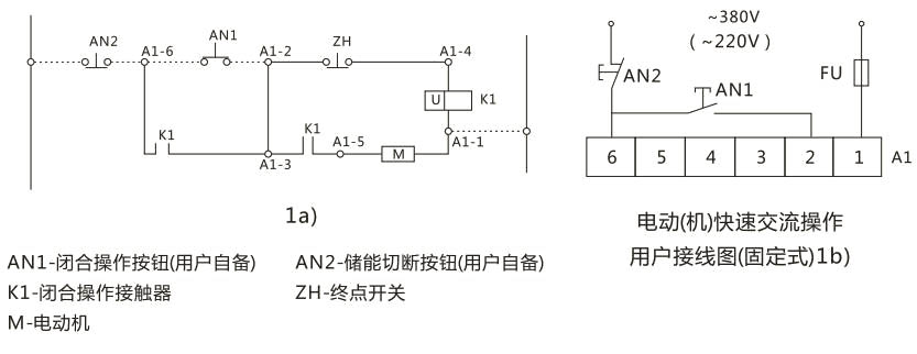 C) 電動(dòng)(機(jī))預(yù)儲(chǔ)能帶釋能交流操作(附su控制線路見(jiàn)圖3),用戶接線見(jiàn)圖3b)。