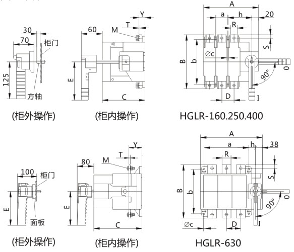 ● 手柄可直接裝在開關(guān)上操作(簡(jiǎn)稱柜內(nèi)操作),也可以通過(guò)加長(zhǎng)軸在配電柜門外操作(簡(jiǎn)稱柜外操作)。