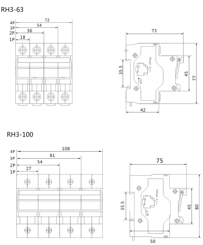 常規(guī)型號(hào)有:RH3-63 1P/2P/3P/4P,RH3-100 1P/2P/3P/4P