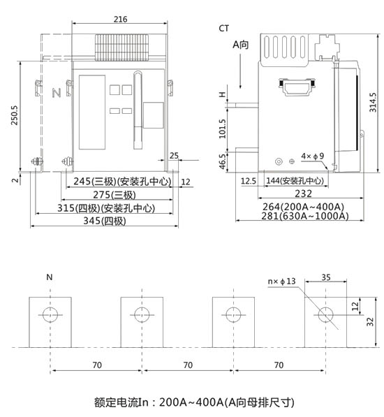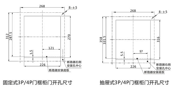 固定式斷路器的安裝尺寸和外形尺寸見圖5