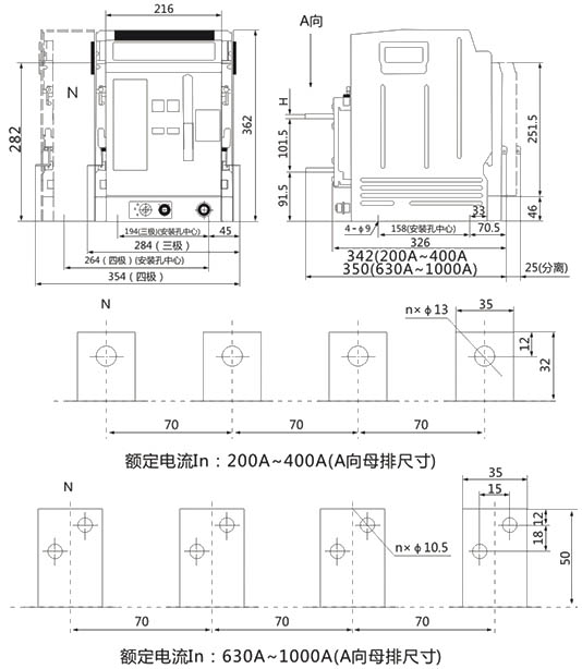 ● 抽屜式斷路器的安裝尺寸和外形尺寸見圖7