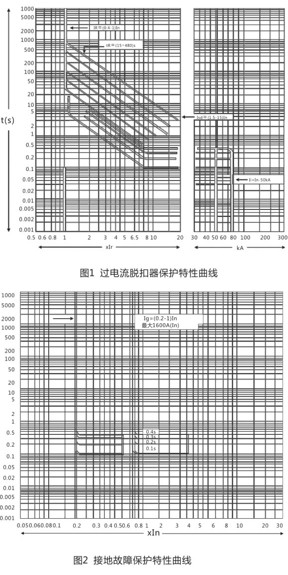 ● 過電流脫扣器特性曲線見圖1,接地故障保護(hù)特性曲線見圖2